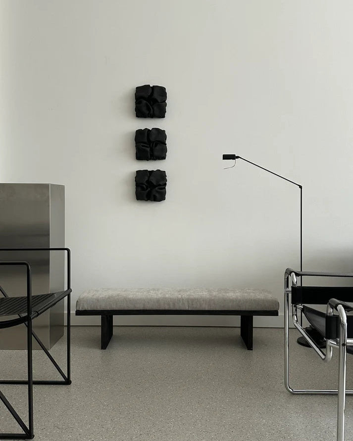A serene composition of soft folds and sculptural texture, this handcrafted piece evokes the elegance of fabric in motion. Each crease is hand-shaped, creating depth, movement, and shadow play across the elongated canvas–bringing quiet sophistication to any contemporary space.
