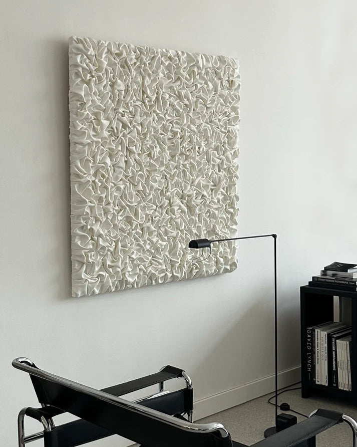 A serene composition of soft folds and sculptural texture, this handcrafted piece evokes the elegance of fabric in motion. Each crease is hand-shaped, creating depth, movement, and shadow play across the elongated canvas–bringing quiet sophistication to any contemporary space.