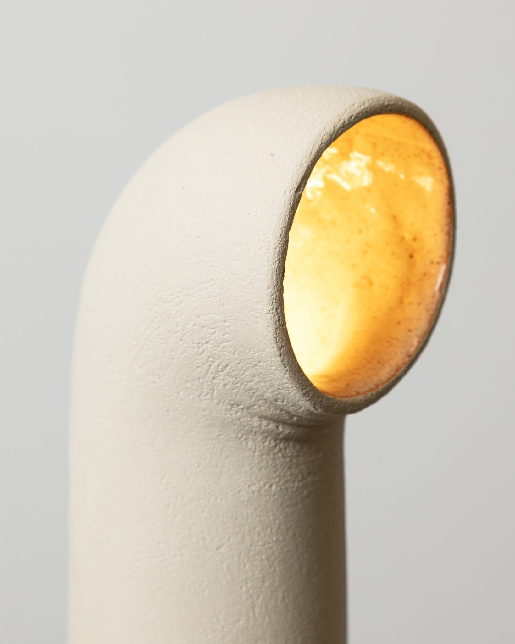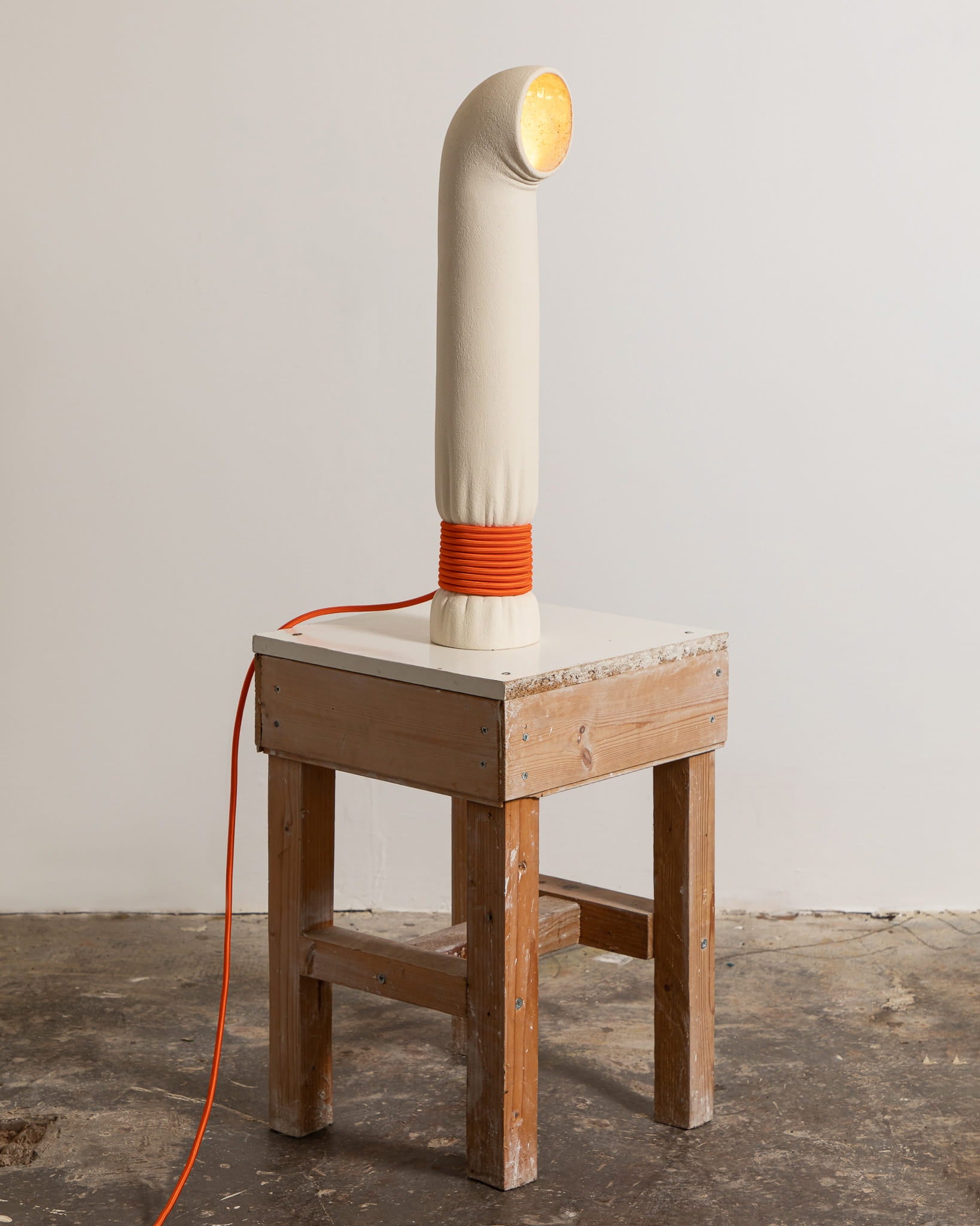 Knotto 01 is a ceramic light formed from white stoneware, defined by an elongated, brutalist silhouette that references industrial structures. An orange cable cinches the form like a ratchet strap, pulling the ceramic surface taut and leaving visible creases that emphasise tension and material force.