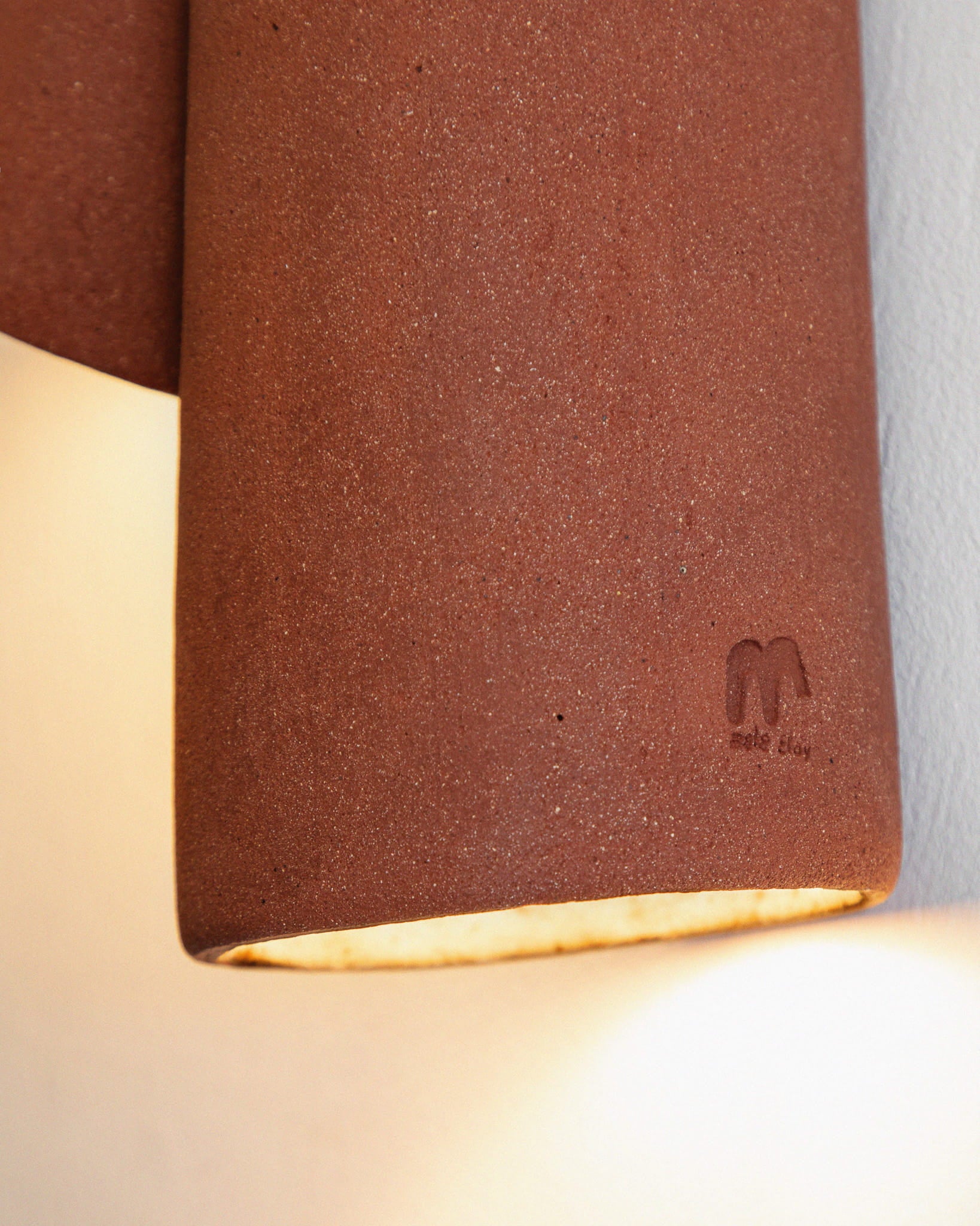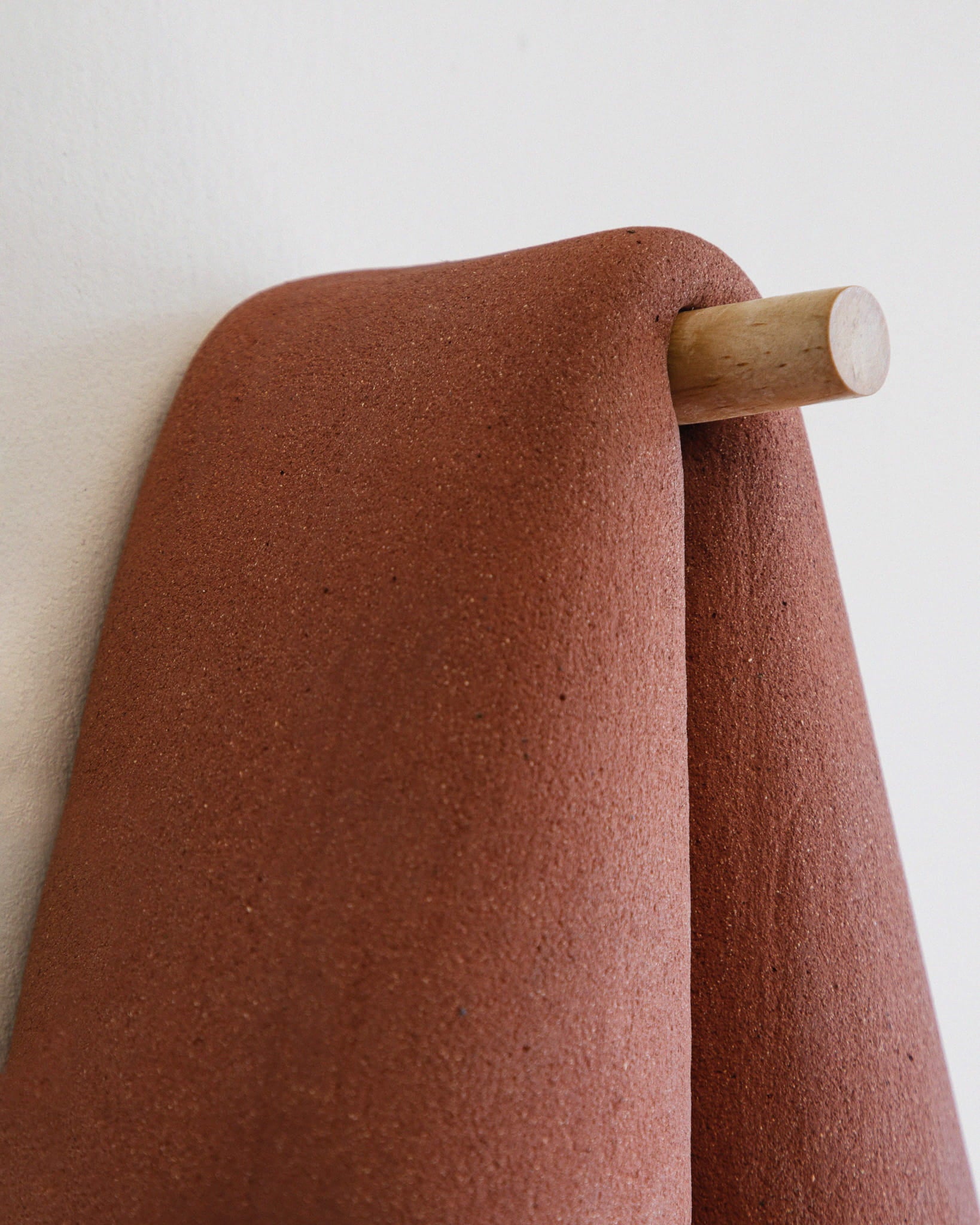 Handcrafted ceramic wall light inspired by clay’s natural response to gravity, with a softly draped form resting on a wooden peg. Hand-built in textured stoneware, it offers gentle illumination with a quiet sculptural presence.
