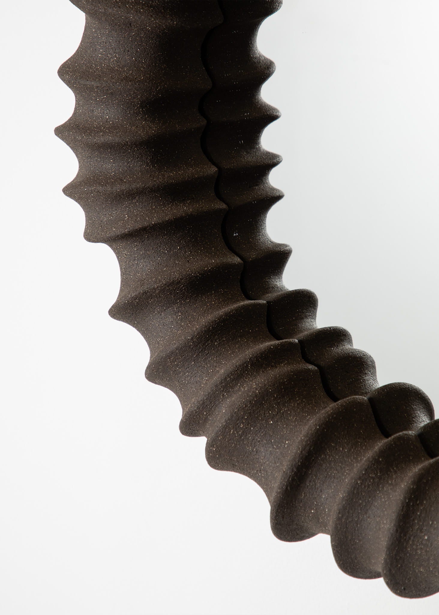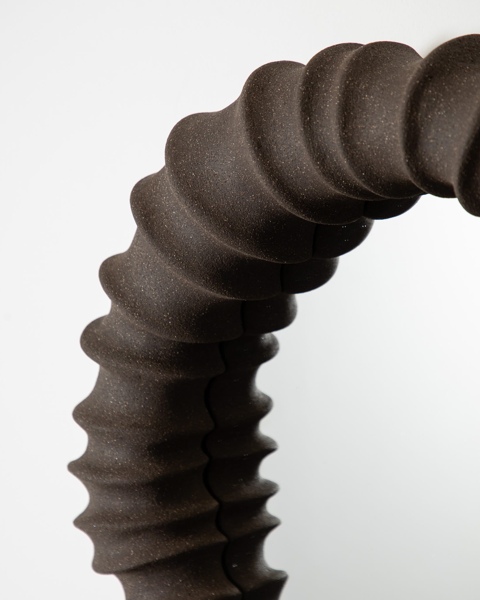 A sculptural ceramic mirror whose stem-like form balances strength and fragility, with curves pushed to the edge of collapse and set in place to preserve the movement of the raw clay.