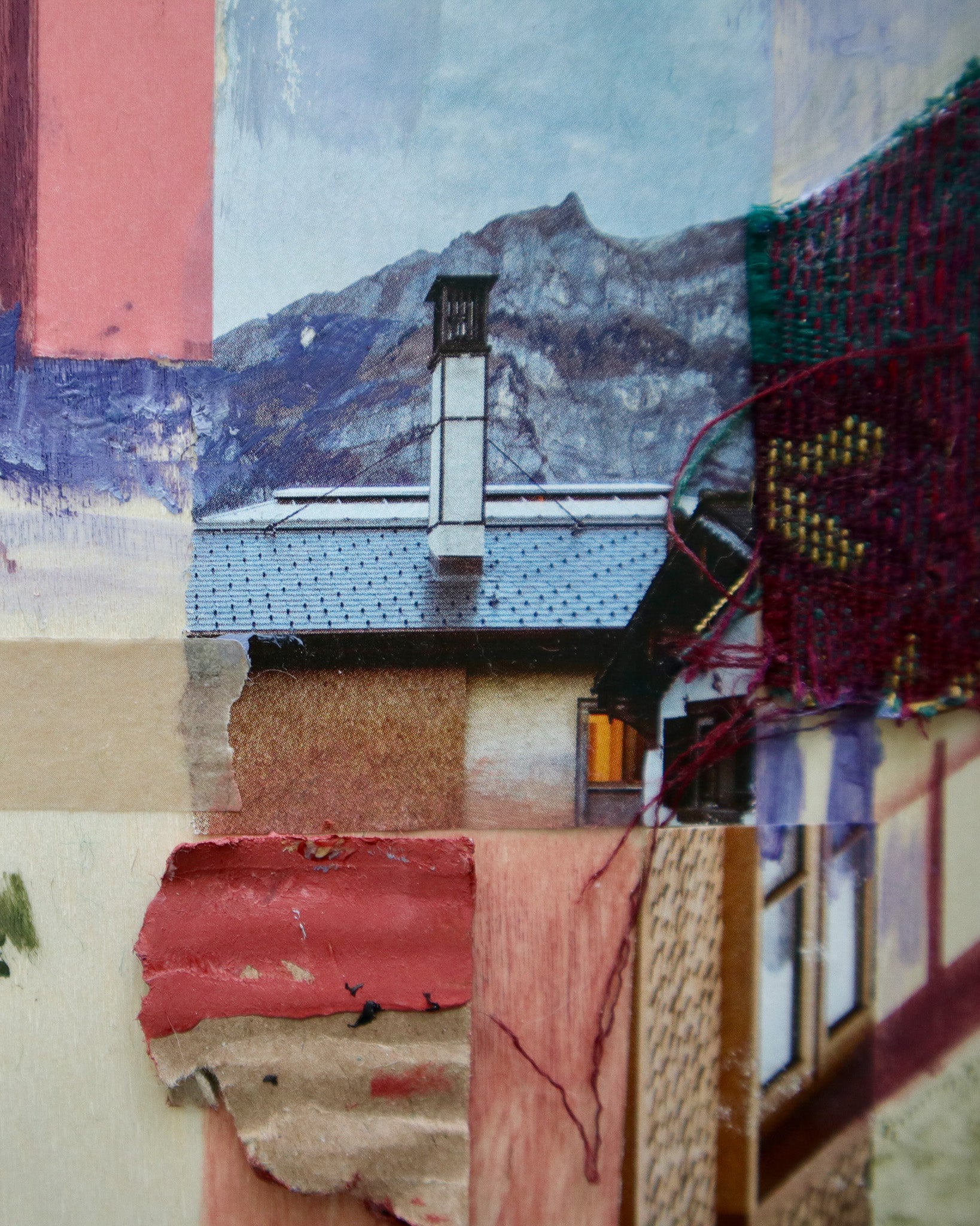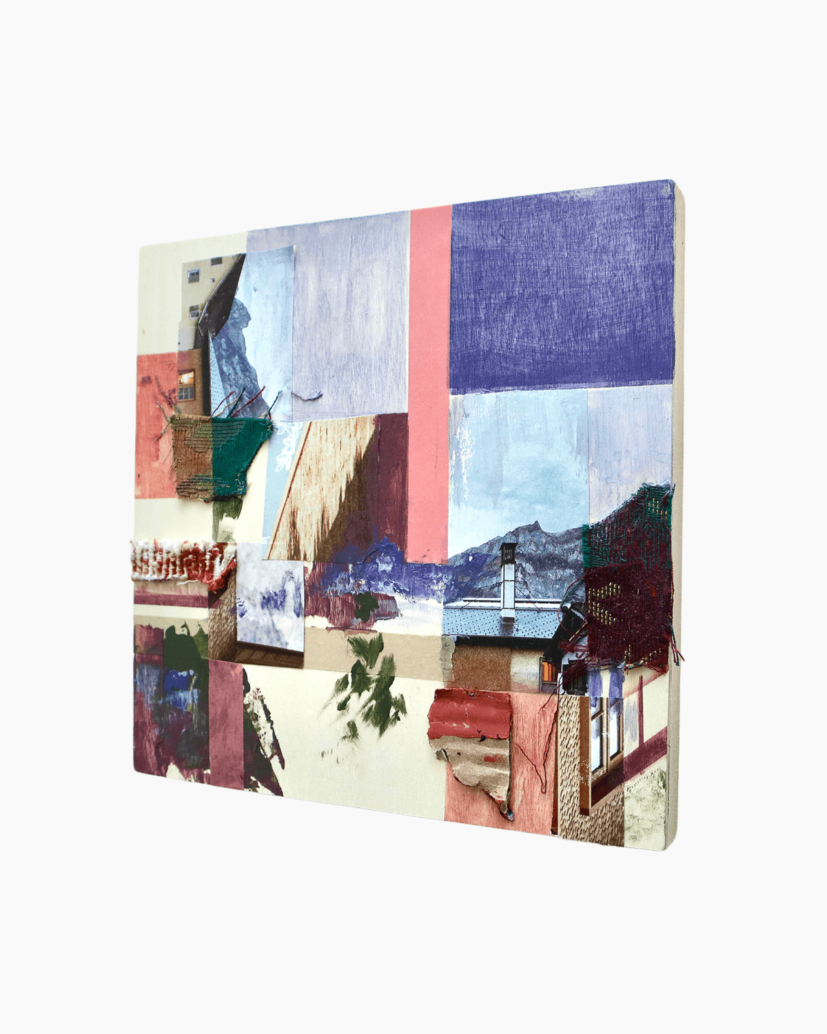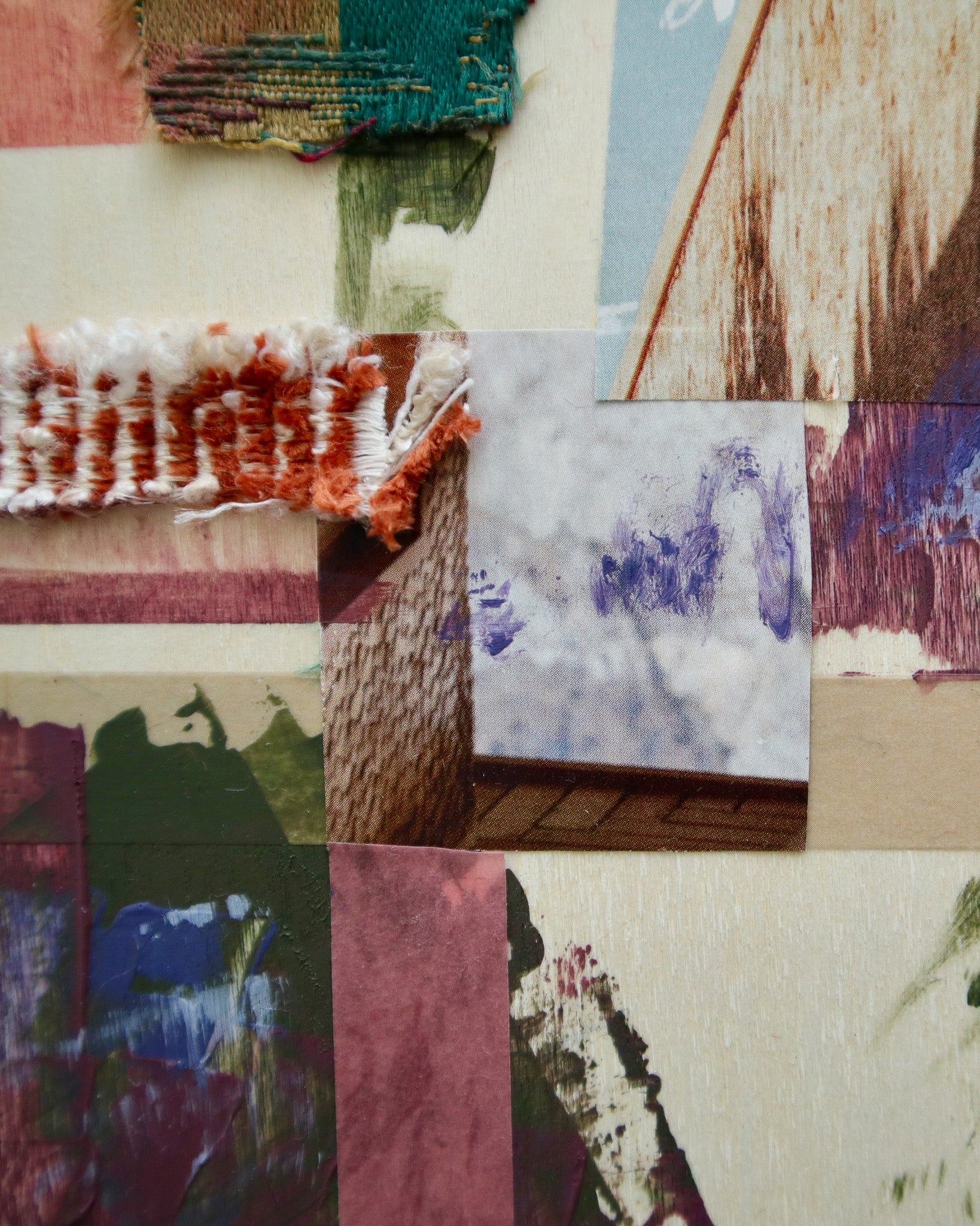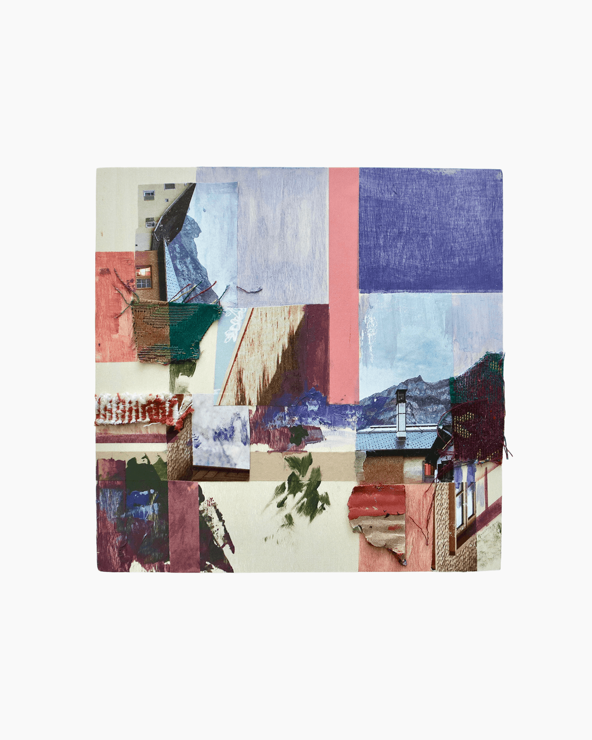 Acrylic, textile, paper and tape on canvas.