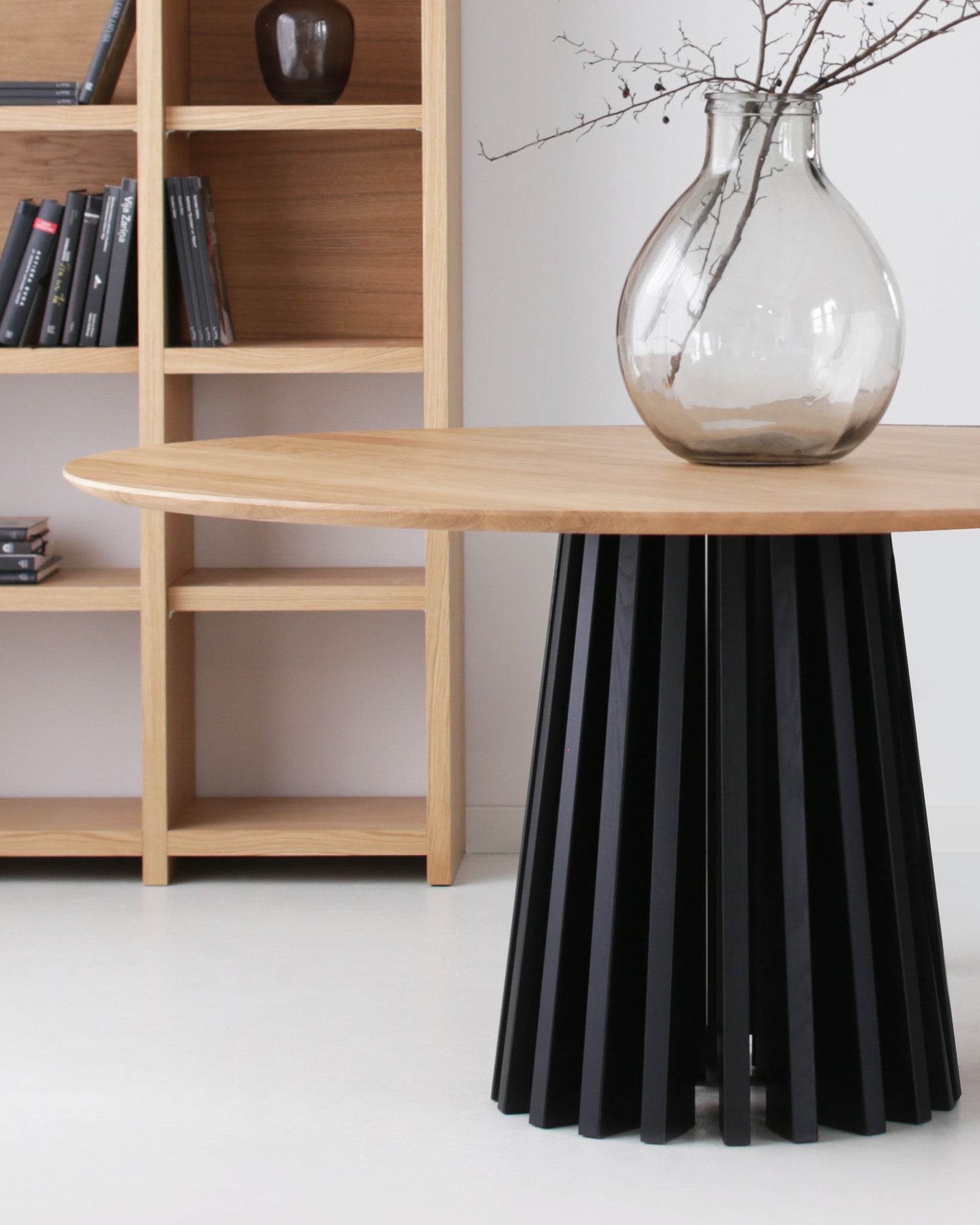 Inspired by architectural rhythm, this six-seater table features a sculptural slatted base and a Natural Oak top, crafted with precision to showcase the material’s natural warmth and grain.